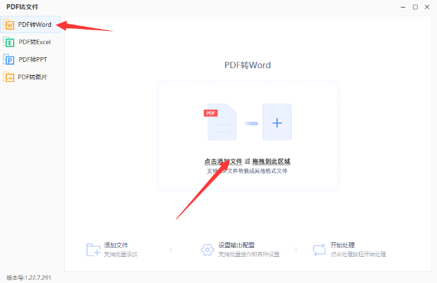 2、确定功能“PDF转Word”后,点击中间上传自己的PDF文件或直接拖到此处。