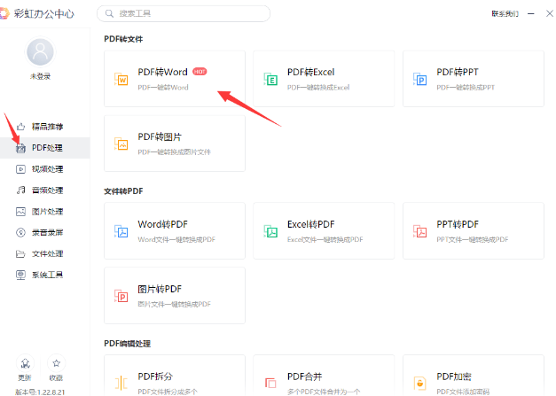 1、打开彩虹办公软件,在“PDF处理”下选择“PDF转Word”;