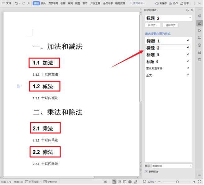 3、继续按住Ctrl键,选中文章中的4个二级目录并单击工具栏【标题2】按钮。