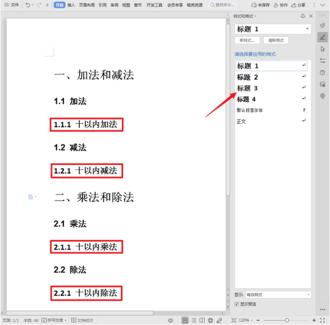 4、最后按住Ctrl键,选中文中的4个三级目录并单击工具栏【标题3】按钮。