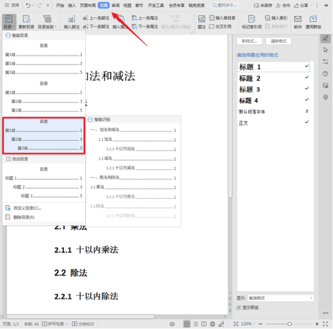 5、最后在菜单栏中切换至【引用】选项卡,单击【目录】,然后选中【3级目录】样式按回车键确认,这时word目录就自动生成了。