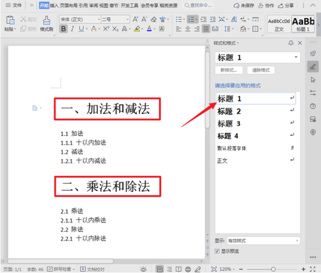 2、然后按住Ctrl键,根据图示选中文章中的2个一级目录,并单击工具栏【标题1】按钮。