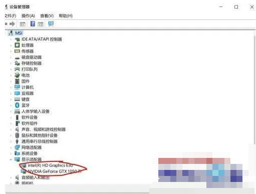 6、点击打开设备管理器后即可可以看到下方的列表,我的是1050TI,和HD630,你的下面列出什么,就说明你的显卡是什么型号的啦。