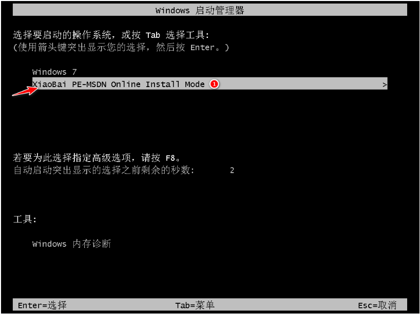 4、电脑重启后进入了开机选项界面,选择xiaobai-pe系统进入。
