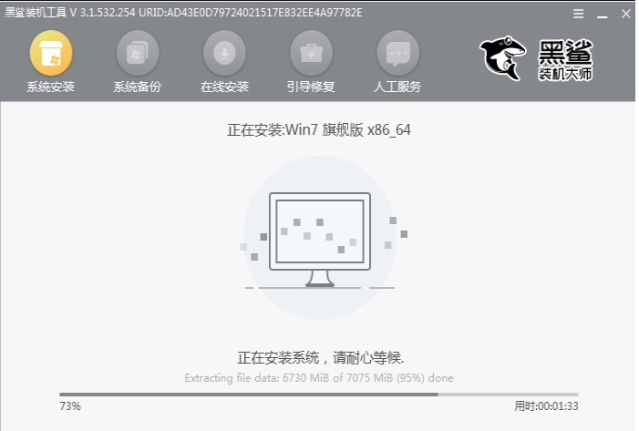 6、进入pe后,等待黑鲨工具自动安装系统。