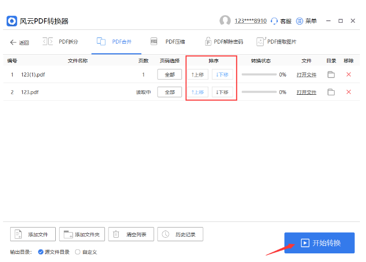 3.添加完成后我们可以通过点击【上移】或者【下移】的方式更改PDF文件的位置,更改完成后我们点击【开始转换】。