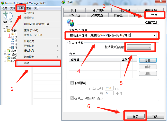2、检查过idm自动接管的浏览器后,再点击“连接”,将连接类型/速度改为“较高速率连接:xxx”,把“默认最大连接数”改为“8(或者16)”,最后点击“确定”即可。