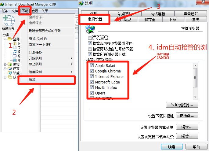 1、打开idm下载器,点击状态栏的“下载——选项——常规设置”,查看idm是否自动接管了浏览器。