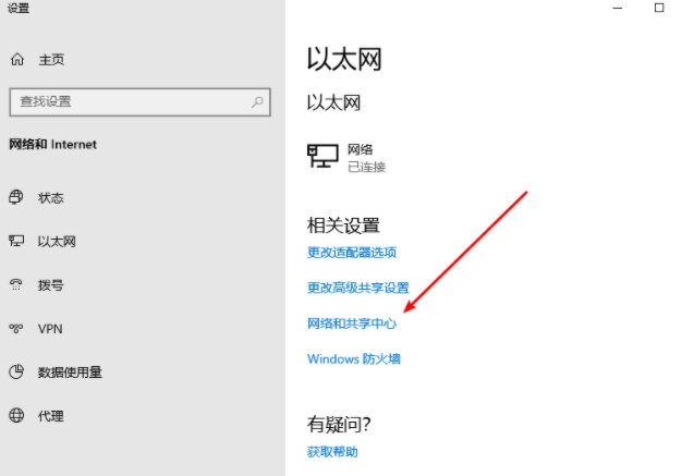 1、打开设置点击以太网,并在右侧找到网络和共享中心选项并点击。