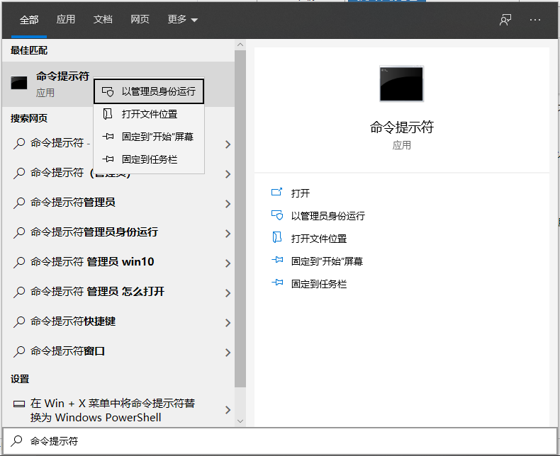 1、在小娜的搜索框中输入【命令提示】符,然后右击【命令提示符】】选择【以管理员身份运行】。
