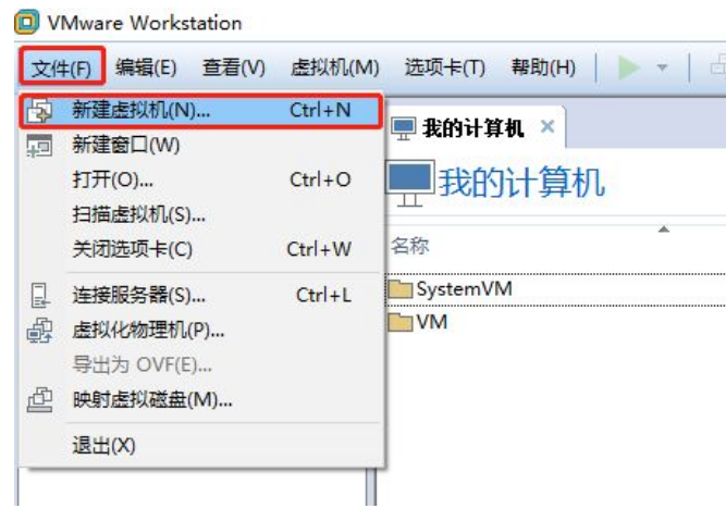 1、打开虚拟机之后,依次点击【文件】->【新建虚拟机】。