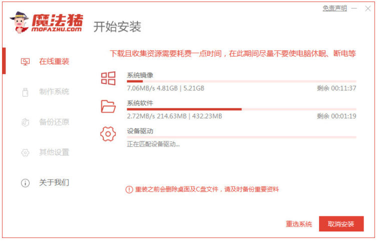 3、等待系统重装资源下载,在此期间尽量不要使电脑休眠、断电等。