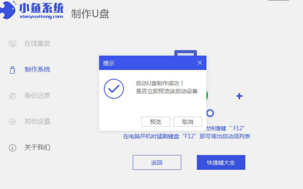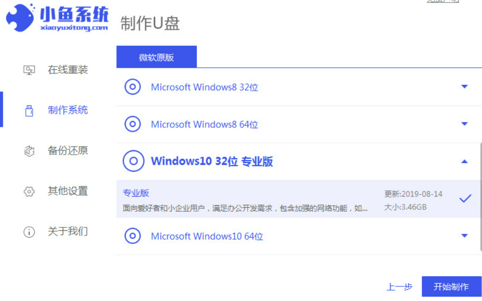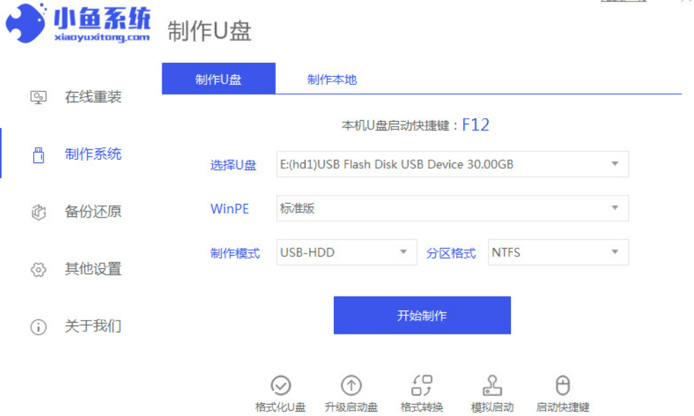 1.首先将u盘插到电脑当中,打开【小鱼一键重装系统】工具,在页面中选中制作系统,点击开始制作。