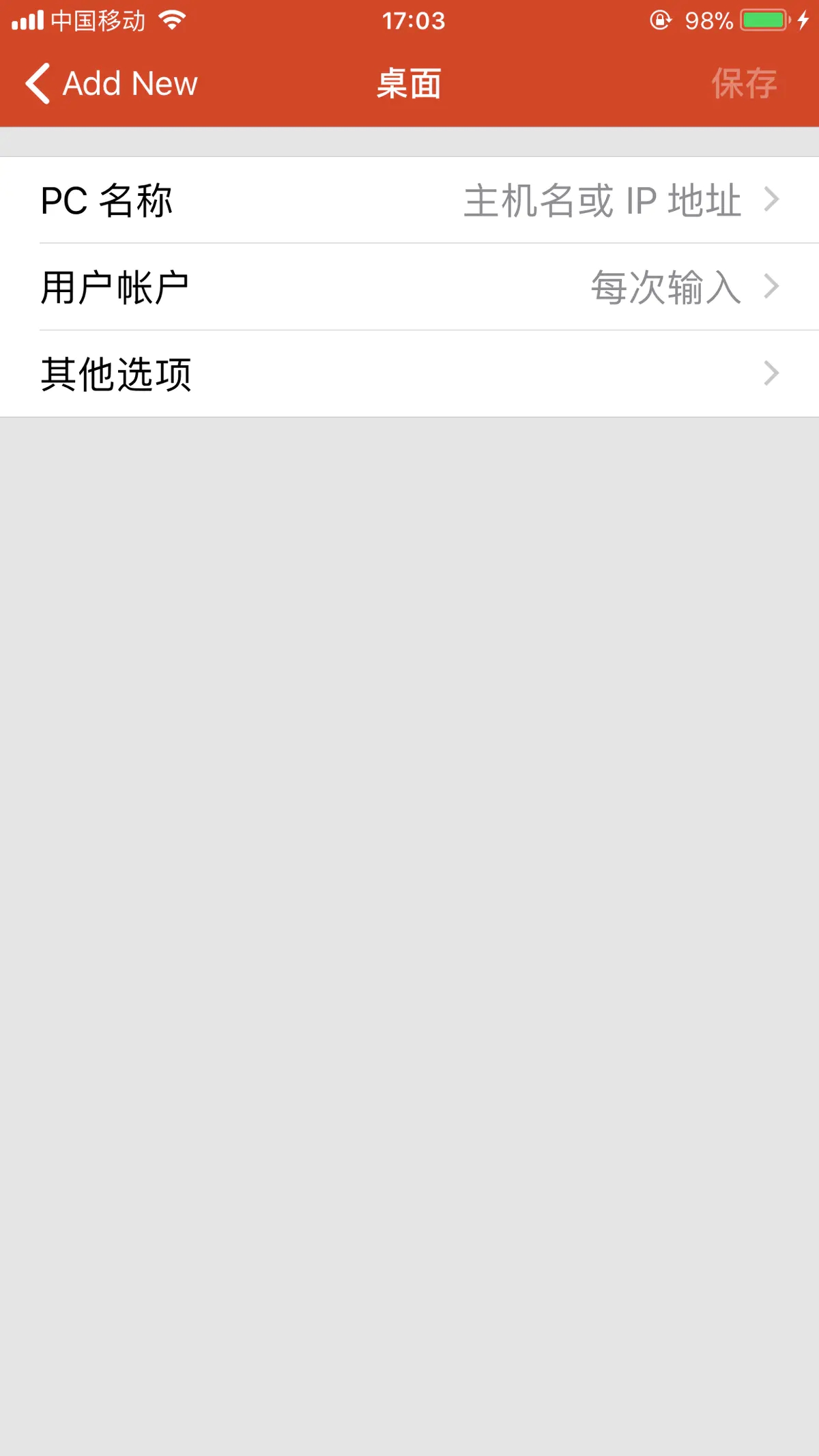 6.选择桌面,会要求输入想要建立远程连接的电脑的名称、IP地址等信息: