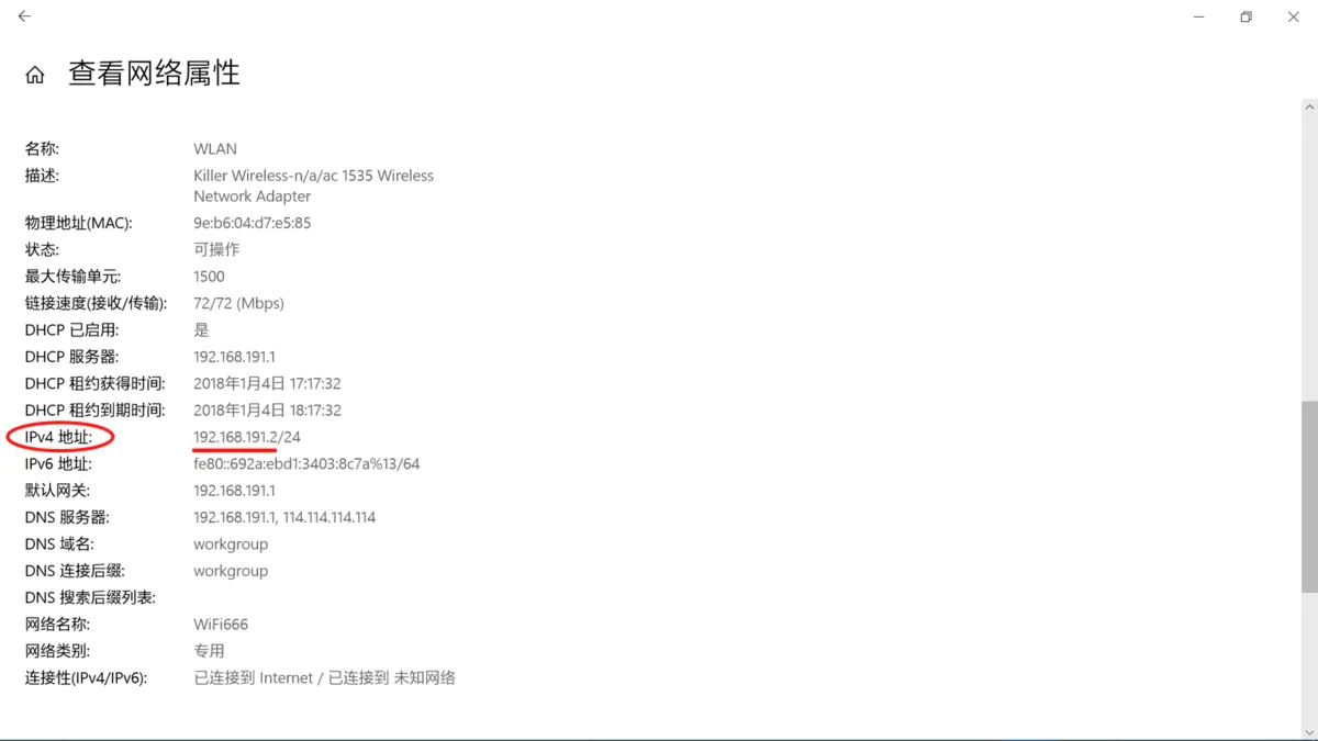 向下拖动,查看网络属性。找到IPv4 地址,注意,只需要将“/”前面的数字作为 IP地址。