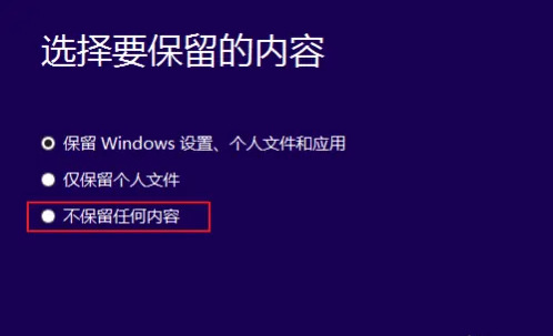 5.将“保留windows设置,个人文件和应用”改成“不保留任何内容”,即将C盘全部重置