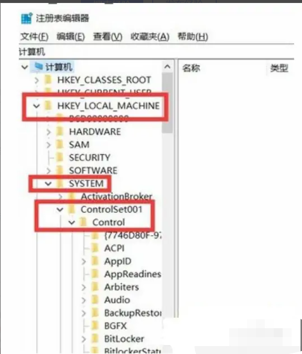 3、依次选择HEKY_LOCAL_MACHINE——SYSTEM——ControlSet001——Control;