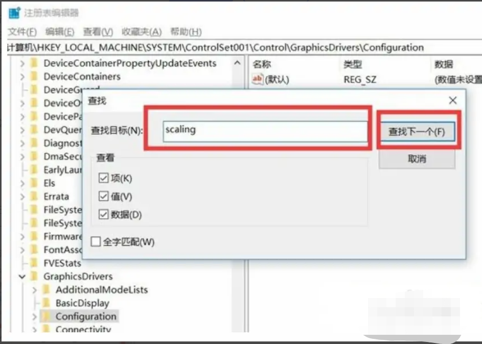 6、输入“scaling”,点击“查找下一个”;