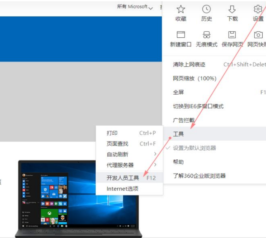 1、在浏览器里打开微软官网,点击菜单栏选择“工具”—“开发人员工具”如下图。