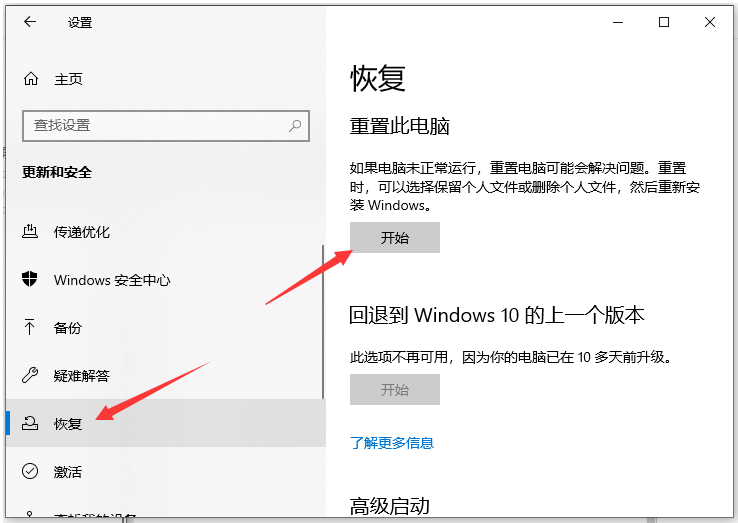 3、点击左侧的恢复,选择重置此电脑的开始。