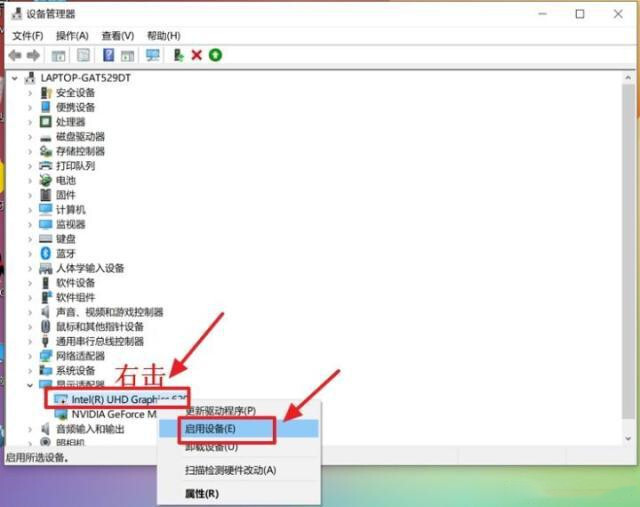 2、此时依次点击“设备管理器”--显示适配器--集成显示卡(如intel集成显卡)--右键点击--“启用设备”重新启用。