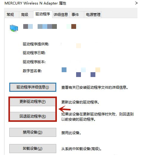 6.点击【更新驱动程序】或者【回退驱动程序】进行修复即可。