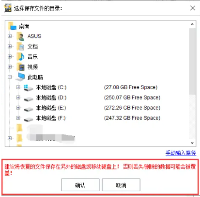 4、这时会弹出恢复文件保存的目录窗口,注意不要保存在文件原来的位置,因为这样会对原来位置的数据进行覆盖,造成二次数据损失;选择保存位置,点击【确定】,文件就会恢复到所需磁盘位置。