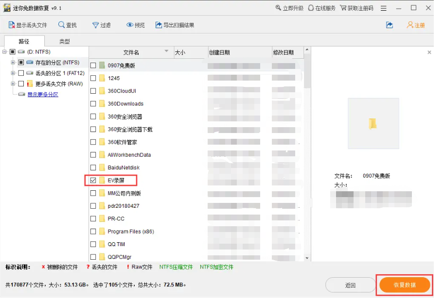 3、等待扫描结束,迷你兔软件就会显示所选分区的所有丢失数据,比如丢失的文件在【EV录屏】中,那么勾选它,然后点击右侧的【恢复数据】。