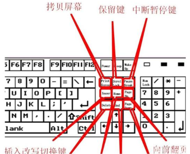 4.Print Screen叫拷贝屏幕,是全屏截图;Scrol Lock是保留键,按下右侧第三个灯会亮起来,作用不大;Pause Break叫中断键暂停键;Insert叫插入改写切换键;Delete叫删除键,删除光标后面的内容;Home是定位到行首;End是定位到行尾;Page Up叫翻页键,向前或向上翻页;Page Down是向后或向下翻页;下方4个箭头叫方向键。