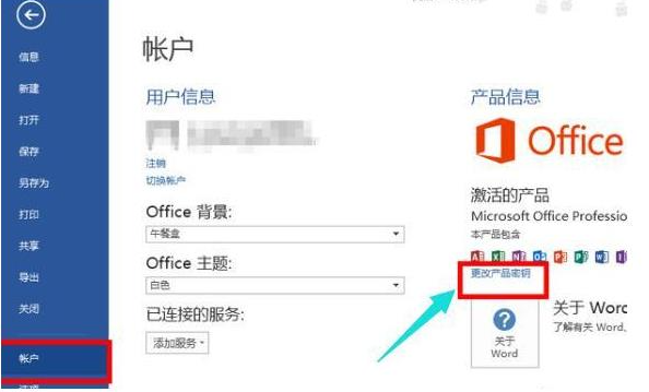 2、点击账户,选择更改产品密钥