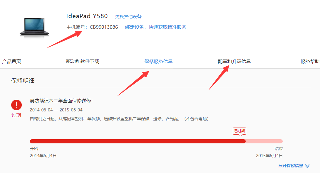 5、点击查询后就可以查看到具体的配置详情和查看到保修情况。如果是能在联想官网上显示出来的,并且官网的配置情况和电脑上的配置码都一样的话,那就是正品。