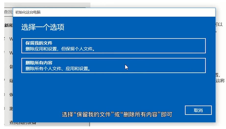 5、随后根据自己需求选择“保留我的文件”或“删除所有内容”即可