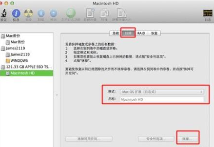 3、选择硬盘然后抹去标签,选择“Mac OS(日志式)”,再输入Macintosh,点击抹掉
