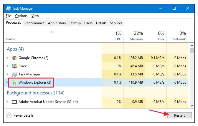 3、从进程列表中选择 Windows 资源管理器,然后单击“重新启动”按钮再次启动它。