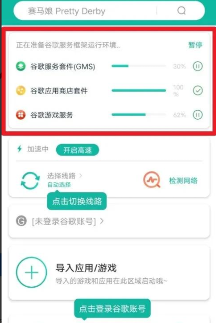 1、下载并运行OurPlay加速器,等待自动下载安装谷歌三件套。