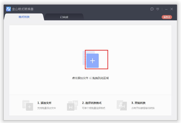 1、首先下载并安装金山格式转换器,随后打开软件,点击主界面的加号添加我们需要转换的文件。