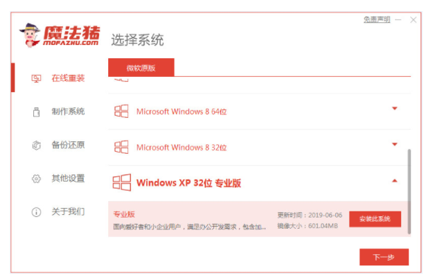2、选择我们要安装的xp系统,点击安装。
