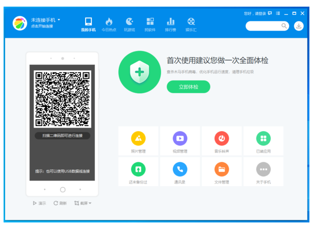 电脑版360手机助手怎么连接手机?我们可以通过数据线连接,也可通过扫描二维码进行连接,具体操作方法如下:
