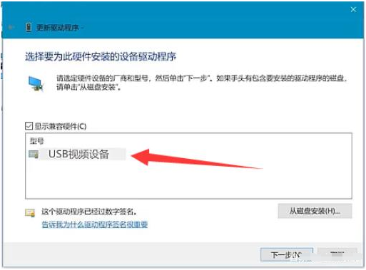 5、选择要为此硬件安装的设备驱动程序,选定硬件设备的厂商和型号进入下一步。如果手头包含要安装的驱动程序的磁盘,那就单击从磁盘安装,在型号中点击USB视频设备,完成后显示USB视频设备,重启电脑即可。