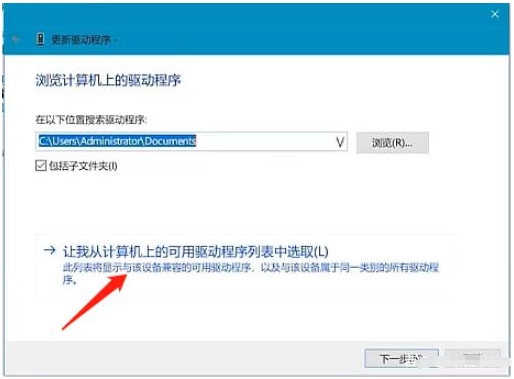 4、选择让我从计算机上的可用驱动程序列表中选取(此列表将显示与该设备兼容的可用驱动程序,以及与该设备属于同一类别的所有驱动程序)。