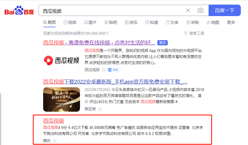 1、在浏览器中搜索“西瓜视频”,随后在搜索结果中点击进入如下红框中的网站链接。
