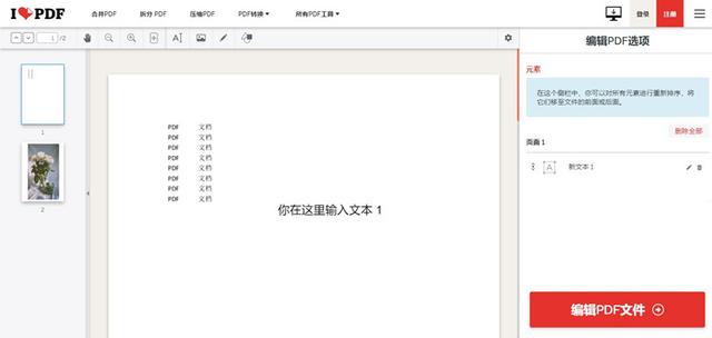 进入到编辑页面后,我们可以在上方操作栏中进行编辑操作,每项编辑操作都会显示在右边的侧栏中,我们可以对其进行排序,将它们移至文件的前面或后面。最后点击右下角的“编辑PDF文件”按钮就可以将编辑操作保存了,将文件下载下来即可。