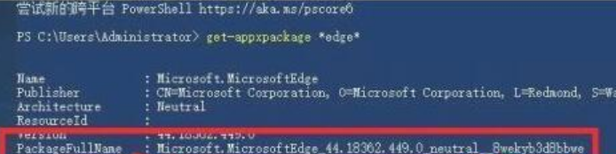 3、然后到达图例位置,可以见到PackageFullName右边的便是该安装包名字“Microsoft.MicrosoftEdge_44.18362.449.0_neutral__8wekyb3d9abwe”。