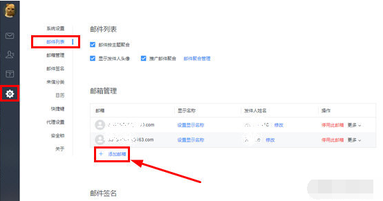 找到左侧栏目中的”齿轮图标“中“邮件列表”并点击,就可以对当下的邮箱账号进行管理,在点击下面的“添加邮箱”选项。
