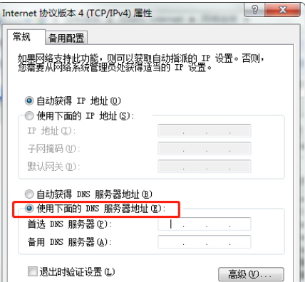 4、进入设置之后我们就可以手动修改了,一般开始默认是自动获取,如果我们需要手动设置dns的话,勾选“使用下面的 DNS 服务器地址(E)”之后,就可以填写dns地址了,如下图