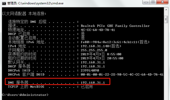 2、在界面中输入命令ipconfig/all,然后按Enter键确认就可以显示查看我们的DNS服务器地址,如下图: