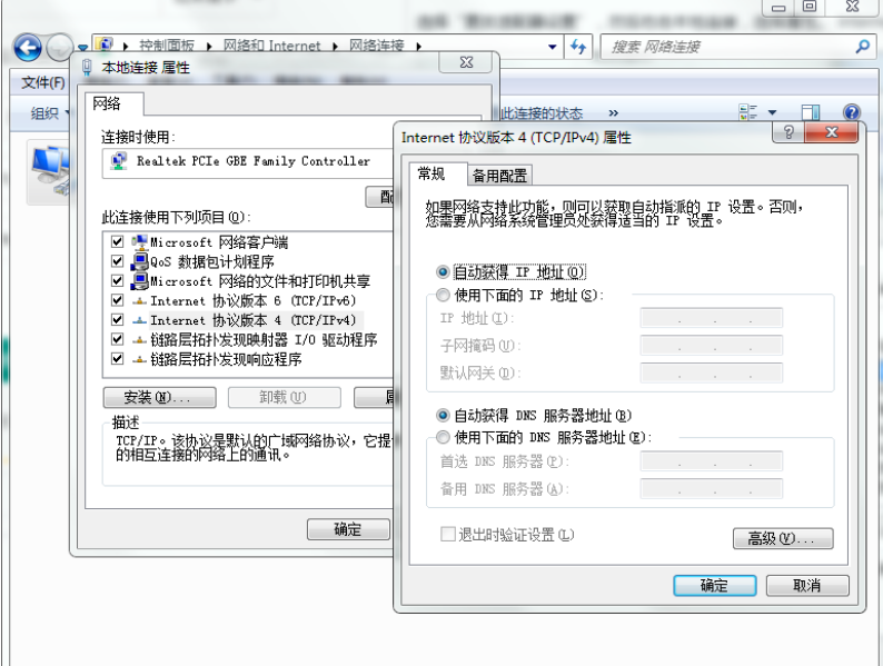 选择“更改适配器设置”,然后右击本地连接,选择属性。找到internet 协议4 (TCP/IPv4),点击其属性,就可以进入设置了,如图所示: