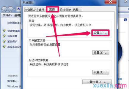 3 在系统属性窗口中,选择“高级”选项卡,在高级界面,点击“性能”下的“设置”按钮。