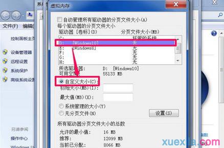 6 要想对虚拟内存进行更改,先去掉“自动管理所有驱动器的分页文件大小”的勾选,然后选择一个分区盘,这里以D盘为例,装了Win10系统那个盘。再选择“自定义大小”这项,