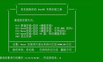 第一步:解压缩“老毛桃WinPE”工具,找到“STEUP”文件夹,双击打开“PESETUP.EXE”,在弹出菜单中选择“Grub安装/启动(U盘、移动硬盘安装)”输入数字“4”,按下回车